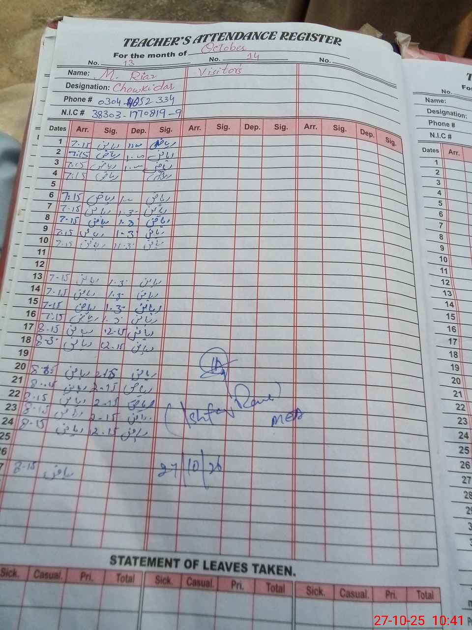 | CNIC | Full Name | Designation | R/C | Absence During Last Calender Month |
