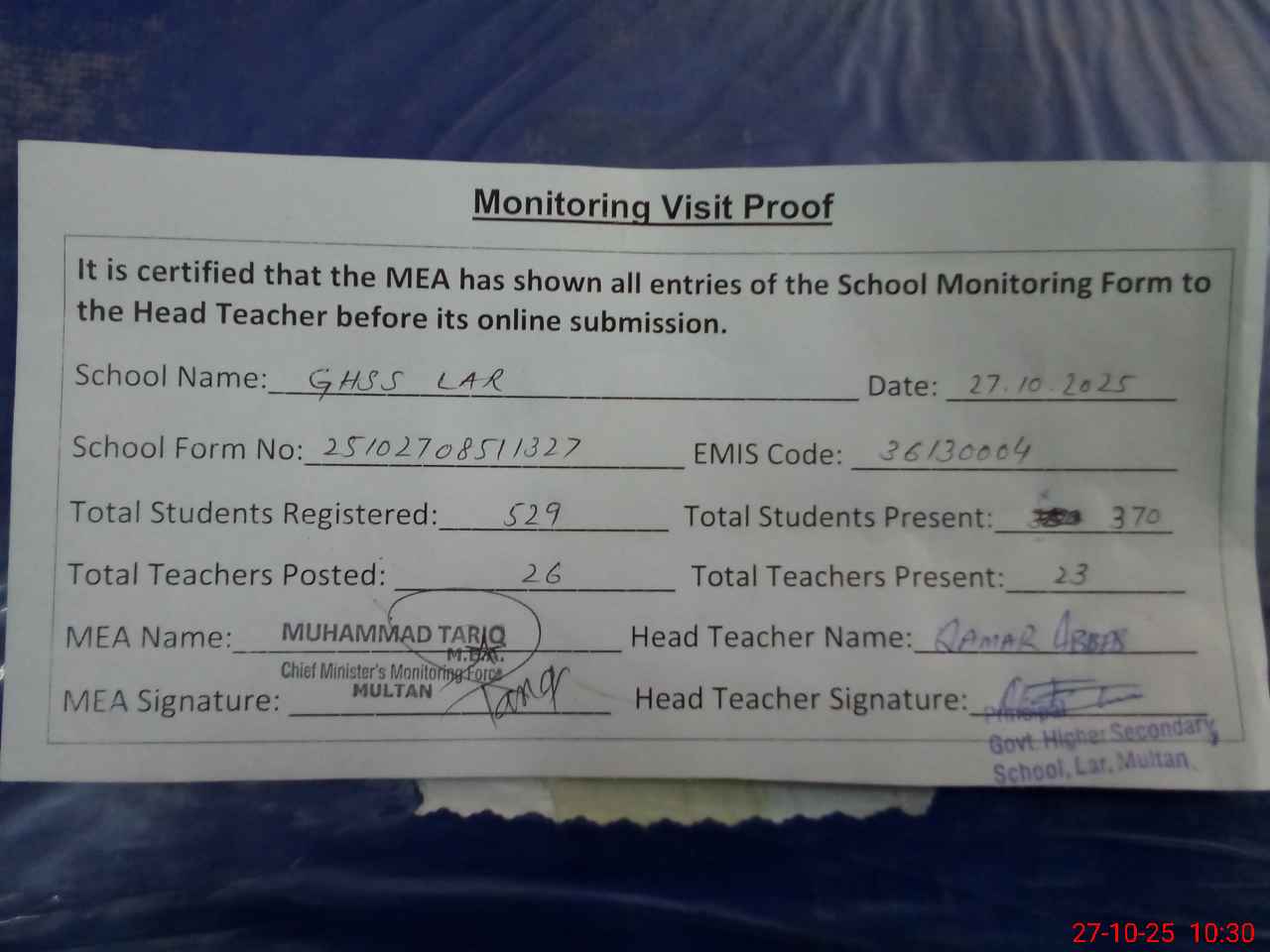 | Remarks (Use Separate Page if Required): THERE IS DIFFERENCE IN BETWEEN SIS ROZNAMCHA AND STUDENTS ATTENDENCE REGISTERS STUDENTS ATTENDENCE LIST OF PREVIOUS SESSION 9TH CLASS STUDENTS ATTENDENCE REGISTERS NOT BEING MAINTAINED SINCE 1ST OCTOBER 2025 | |||||