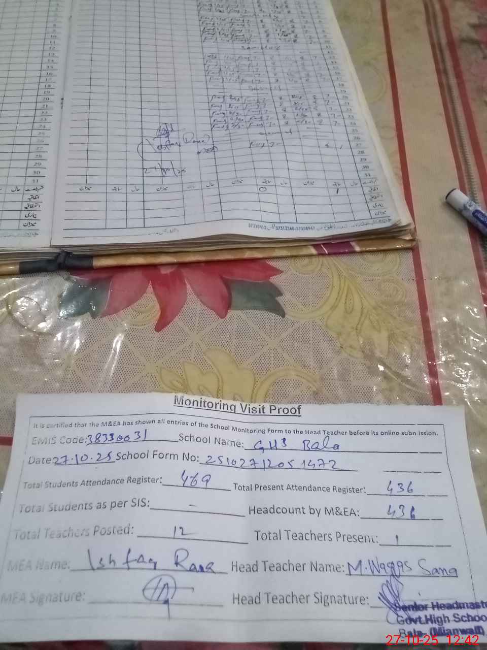 | Attendance Register | Head Teacher | MEA with School | Visit Proof |