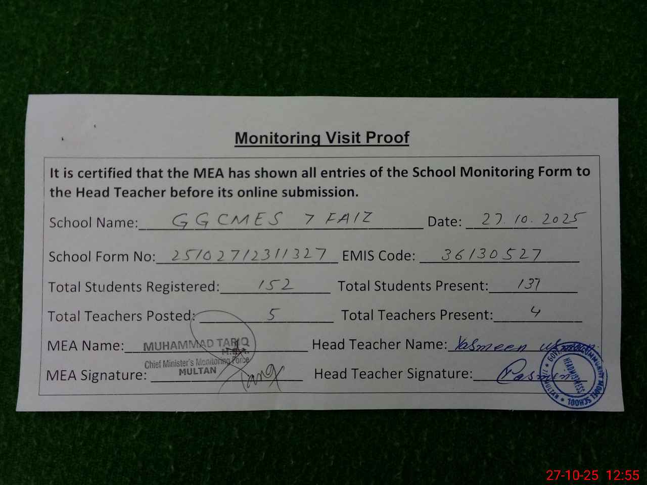 | Attendance Register | Head Teacher | MEA with School | Visit Proof |
