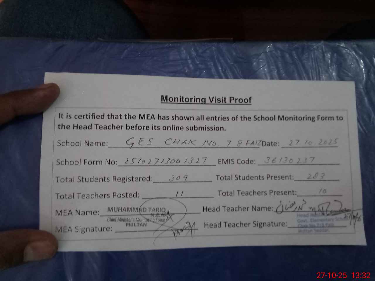 | Monitoring Date: 27-10-2025 | Start Time: 27-10-2025 01:00 PM | End Time: 27-10-2025 01:37 PM | Name of MEA: MU**** TA**** | |