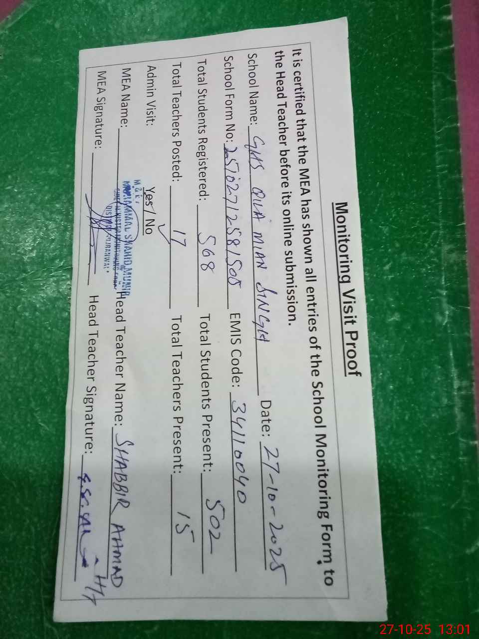 | EMIS Code: 34110040 | Name of School: GHS QILA MIAN SINGH | |||