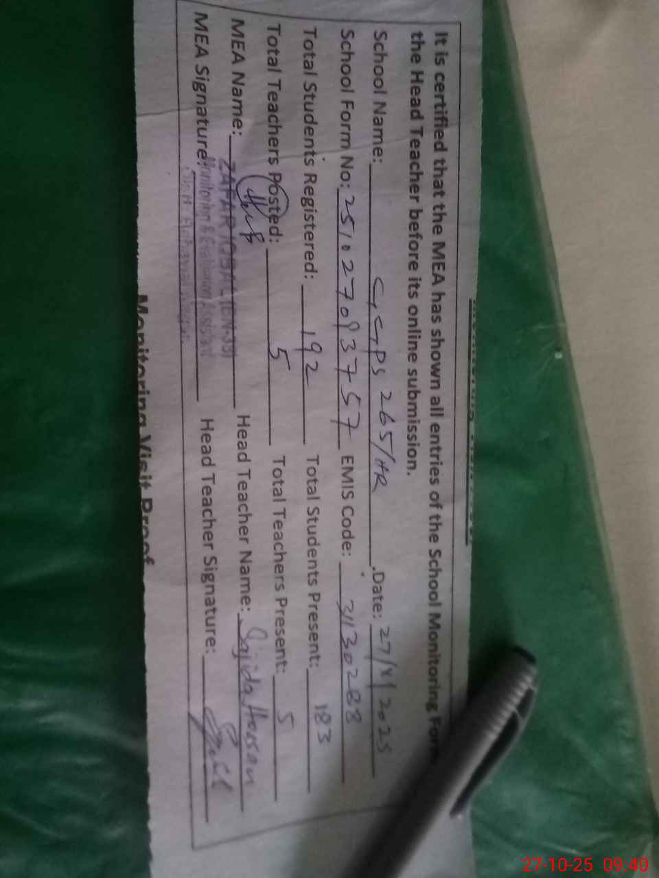 | Attendance Register | Head Teacher | MEA with School | Visit Proof |