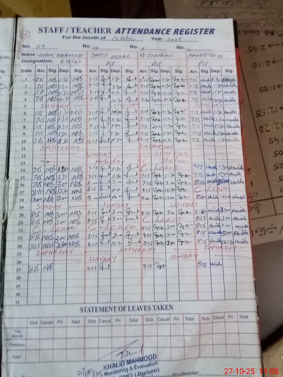 | Attendance Register | Head Teacher | MEA with School | Visit Proof |