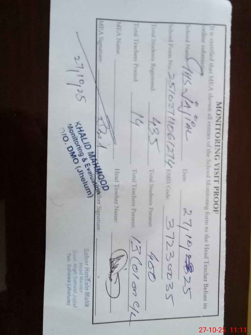 | Certified that this School was Inspected by the Undersigned MEA/DMO Today and the Information Stated Above is as Per Record. | |||||