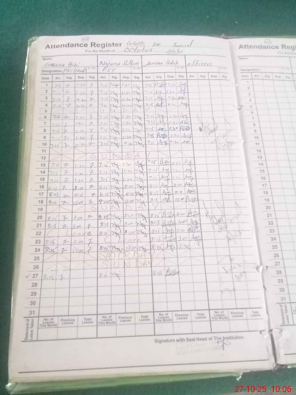 | Monitoring Date: 27-10-2025 | Start Time: 27-10-2025 09:49 AM | End Time: 27-10-2025 10:10 AM | Name of MEA: Fa**** Mu**** | |