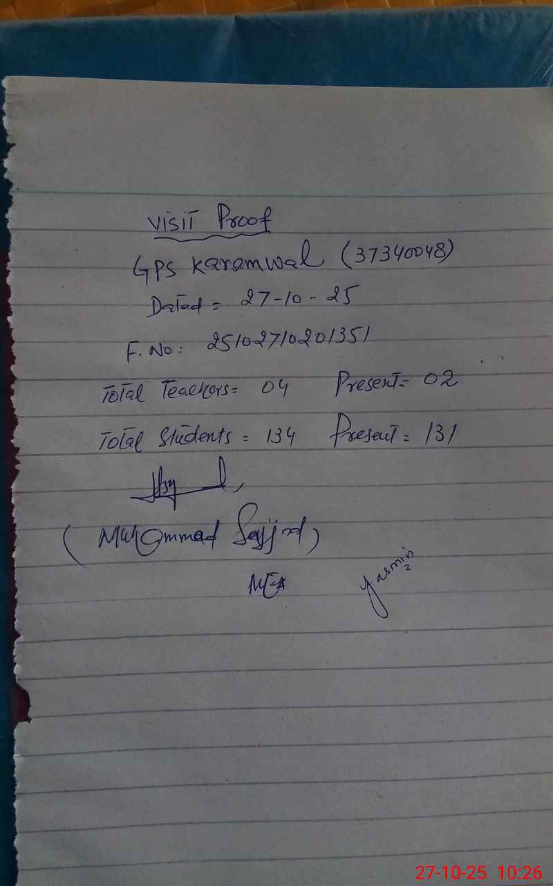 | EMIS Code: 37340048 | Name of School: GPS KARAM WAL | |||