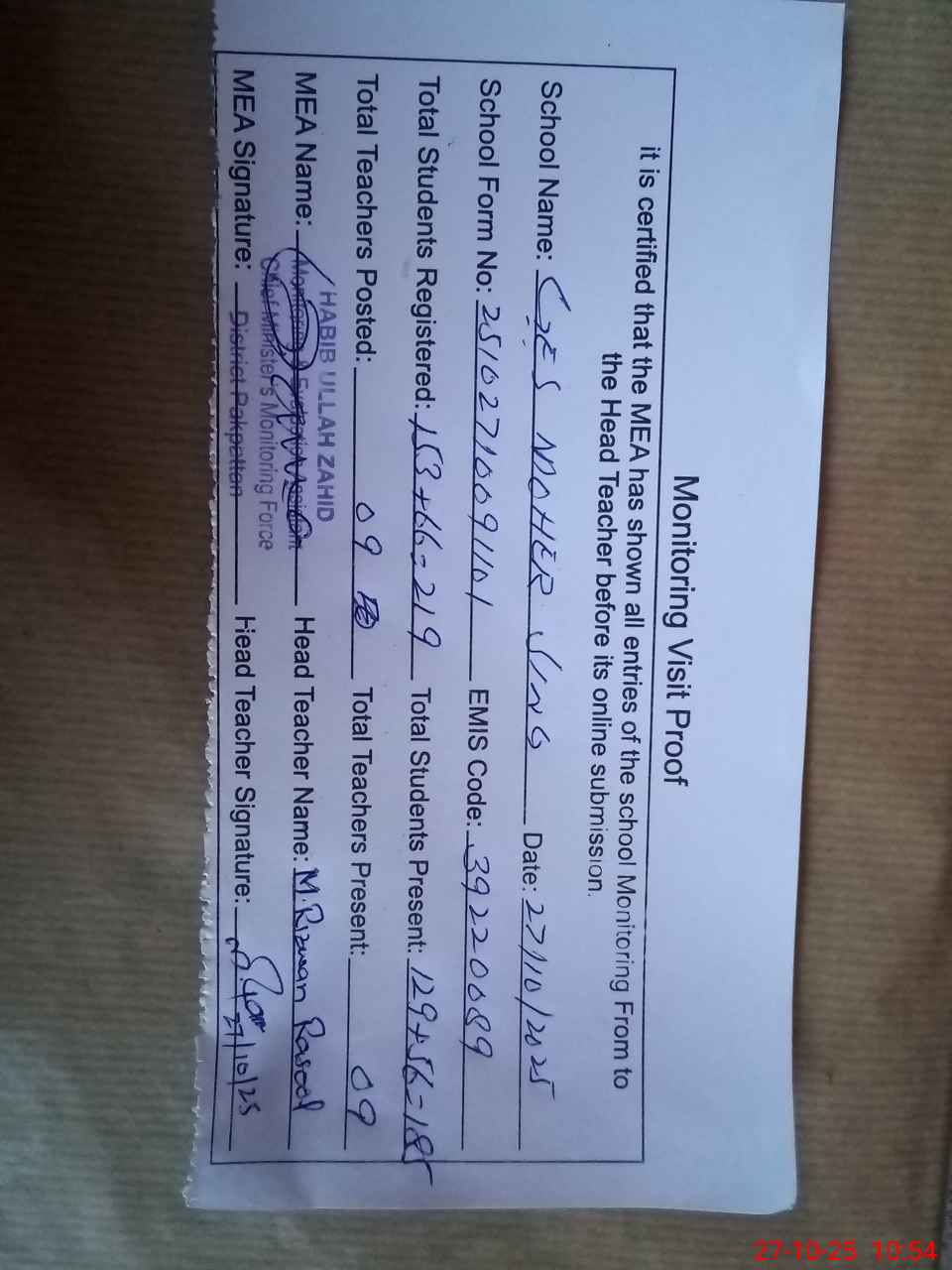 | Attendance Register | Head Teacher | MEA with School | Visit Proof |