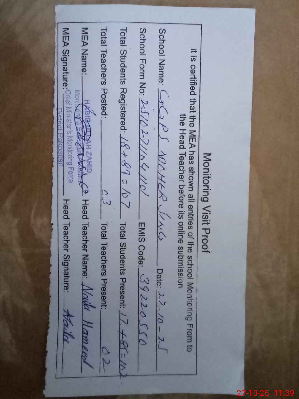 | Attendance Register | Head Teacher | MEA with School | Visit Proof |