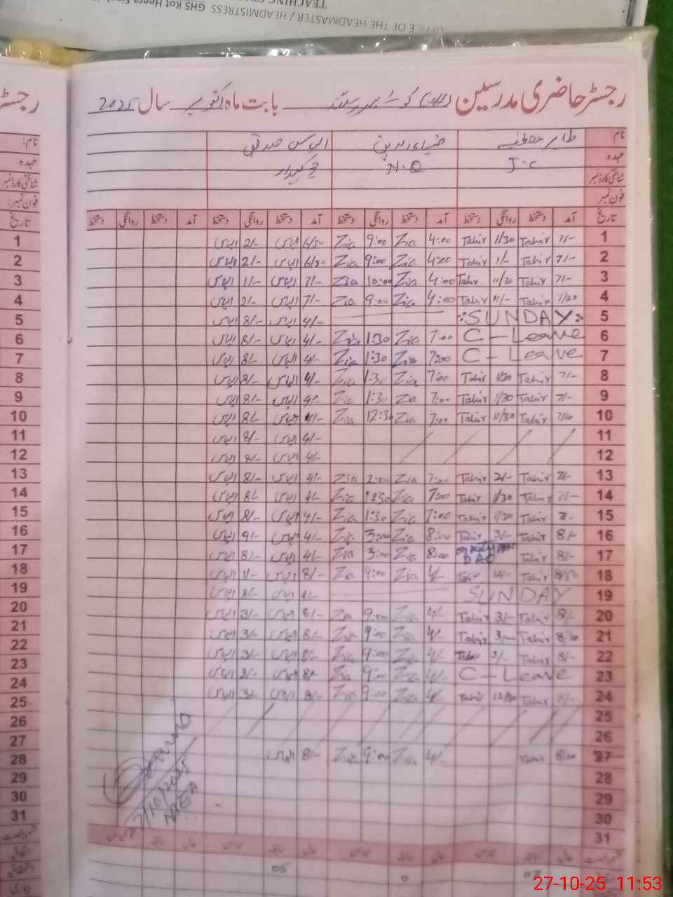 | CNIC | Full Name | Designation | R/C | Absence During Last Calender Month |