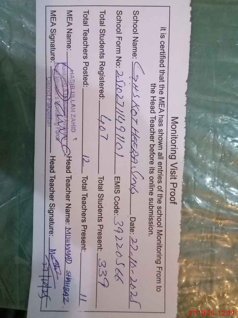 | Certified that this School was Inspected by the Undersigned MEA/DMO Today and the Information Stated Above is as Per Record. | |||||