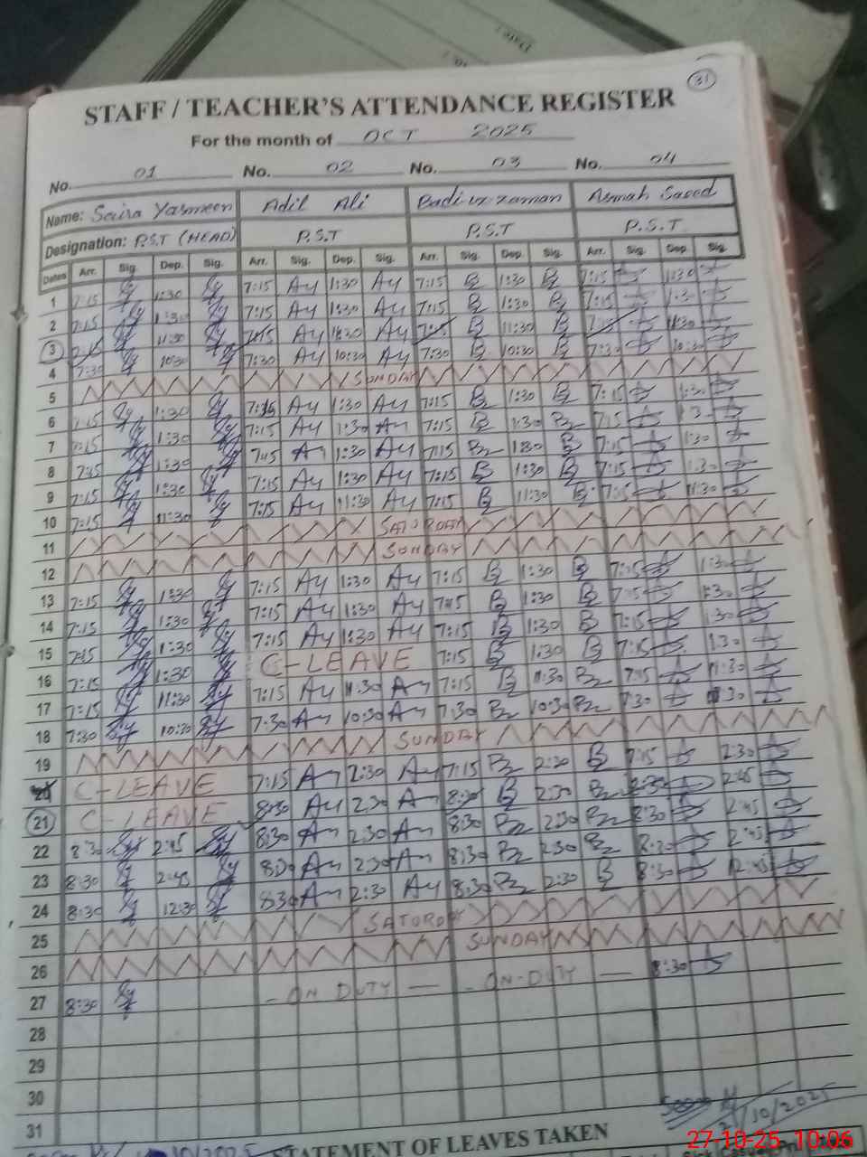 | Leave | Duty | Absent | Maternity | Medical | Ex- Pak |