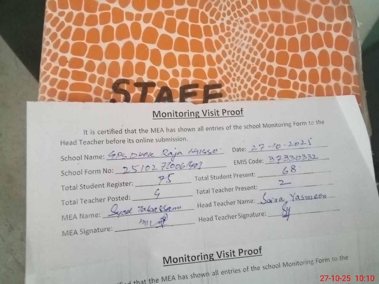 | Attendance Register | Head Teacher | MEA with School | Visit Proof |