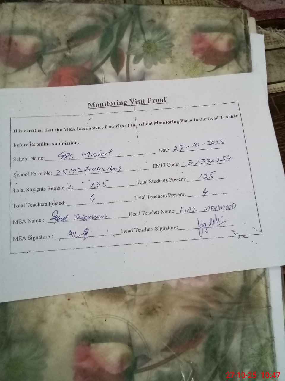 | Attendance Register | Head Teacher | MEA with School | Visit Proof |