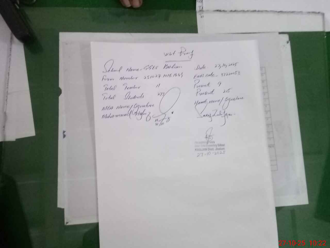 | Remarks (Use Separate Page if Required): Sir Fake attendance of students on students register FTF not properly maintain July and August deposit slip not shown from Headmistress Sadaf Zulifqar This school have not own school building and own location GGES Kaslian 37220053 is running in GHS Kaslian 5 x class rooms of GHS Kaslian with GGES Kaslian | |||||
