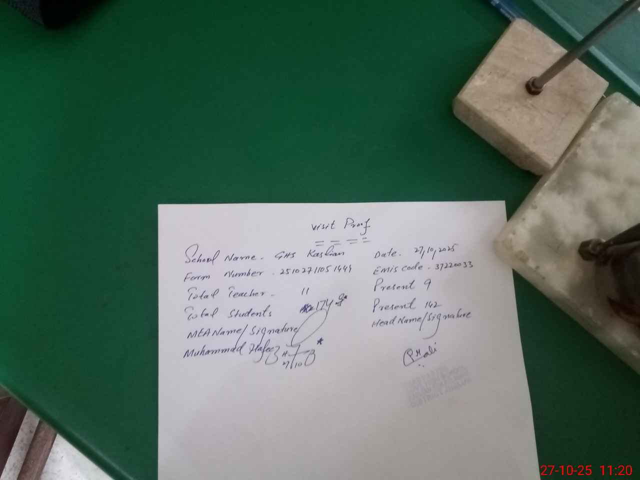 | Attendance Register | Head Teacher | MEA with School | Visit Proof |