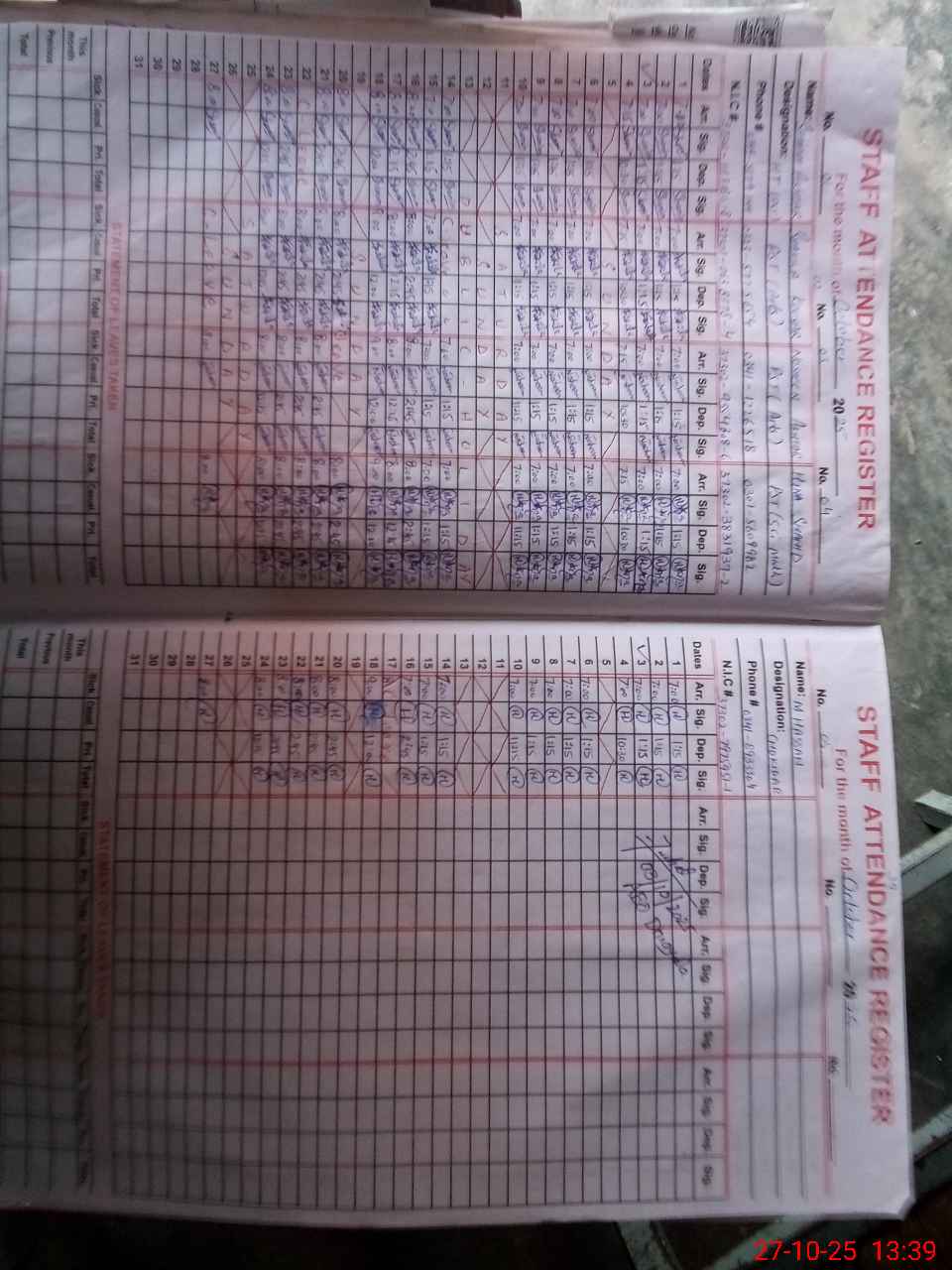 | CNIC | Full Name | Designation | R/C | Absence during last cal. month |