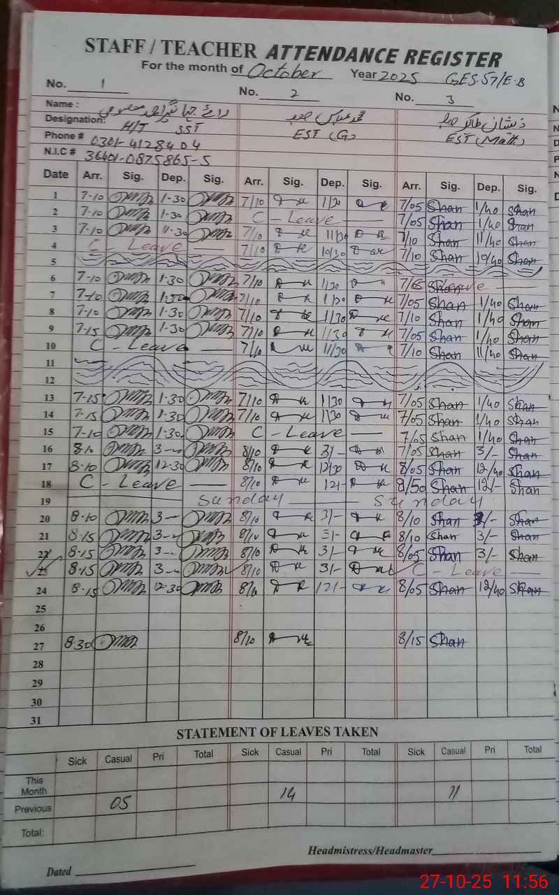 | CNIC | Full Name | Designation | R/C | Absence During Last Calender Month |