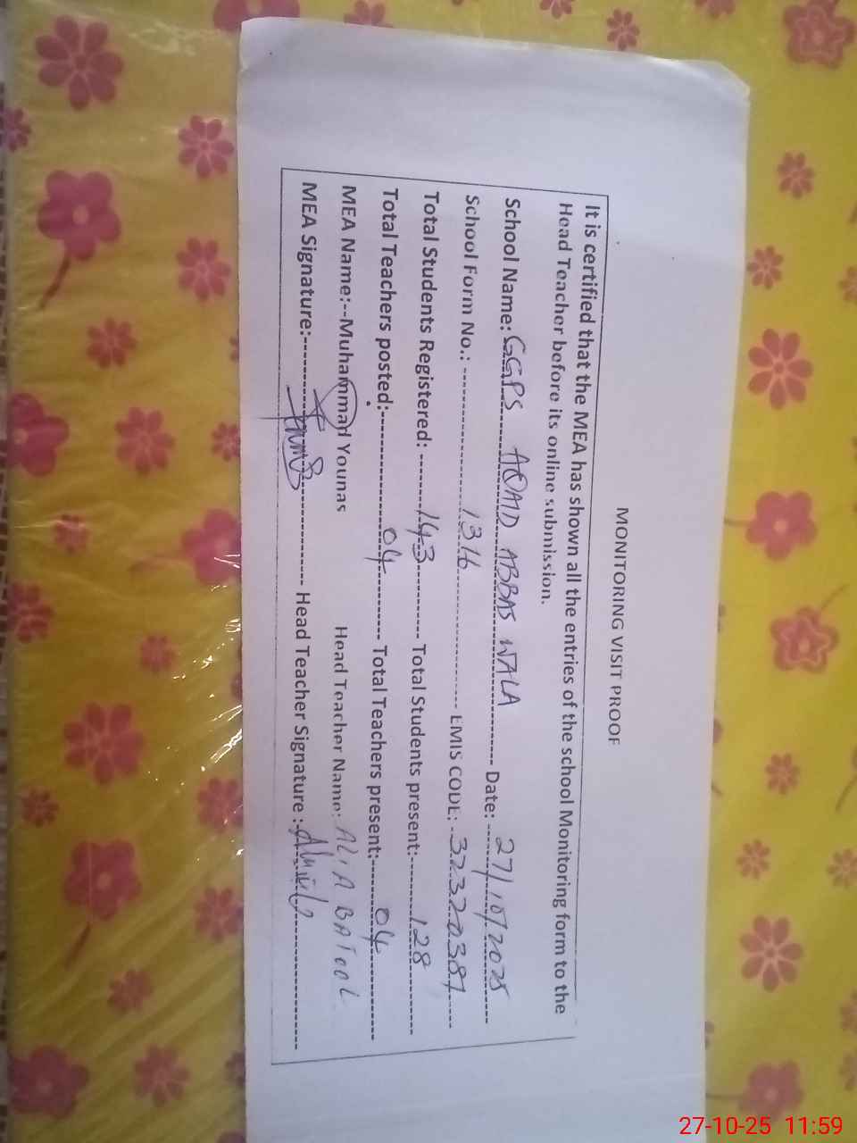 | Attendance Register | Head Teacher | MEA with School | Visit Proof |