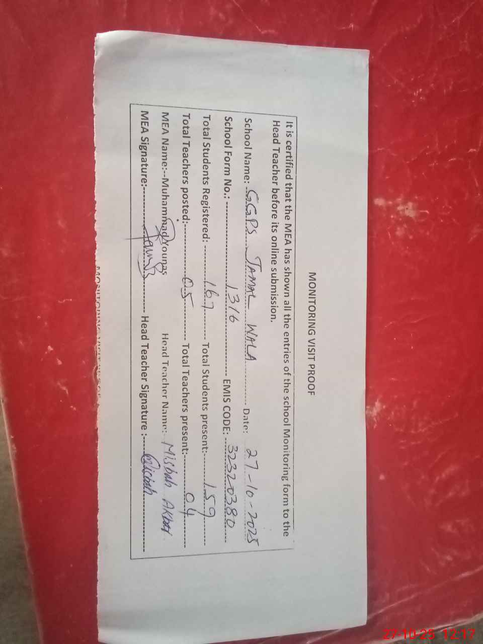 | Attendance Register | Head Teacher | MEA with School | Visit Proof |