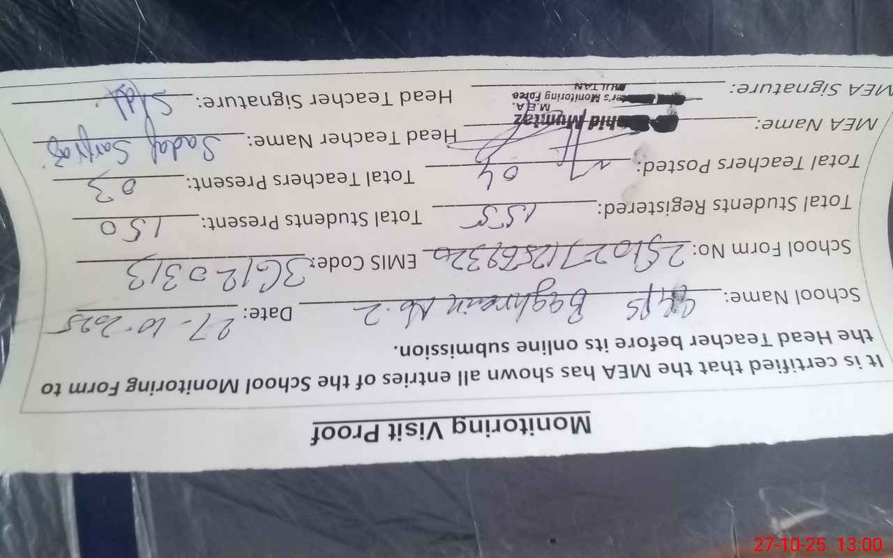 | Attendance Register | Head Teacher | MEA with School | Visit Proof |