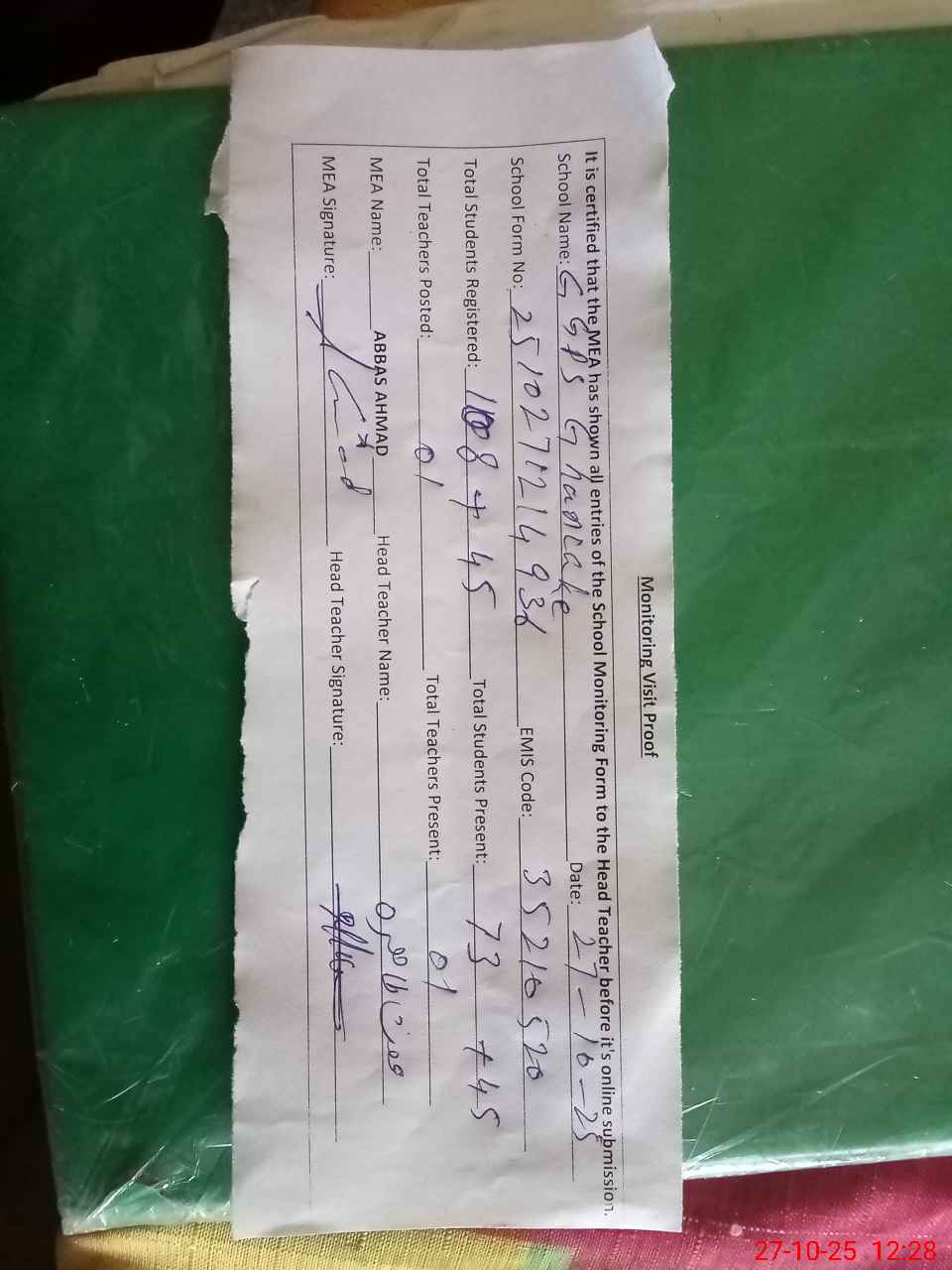 | EMIS Code: 35210520 | Name of School: GGPS GHUNIKAY KAY | |||
