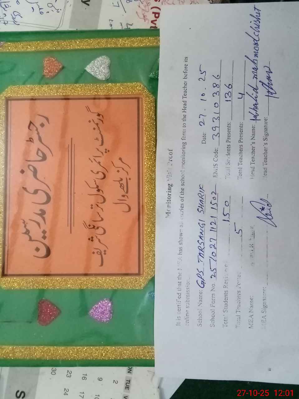 | Attendance Register | Head Teacher | MEA with School | Visit Proof |