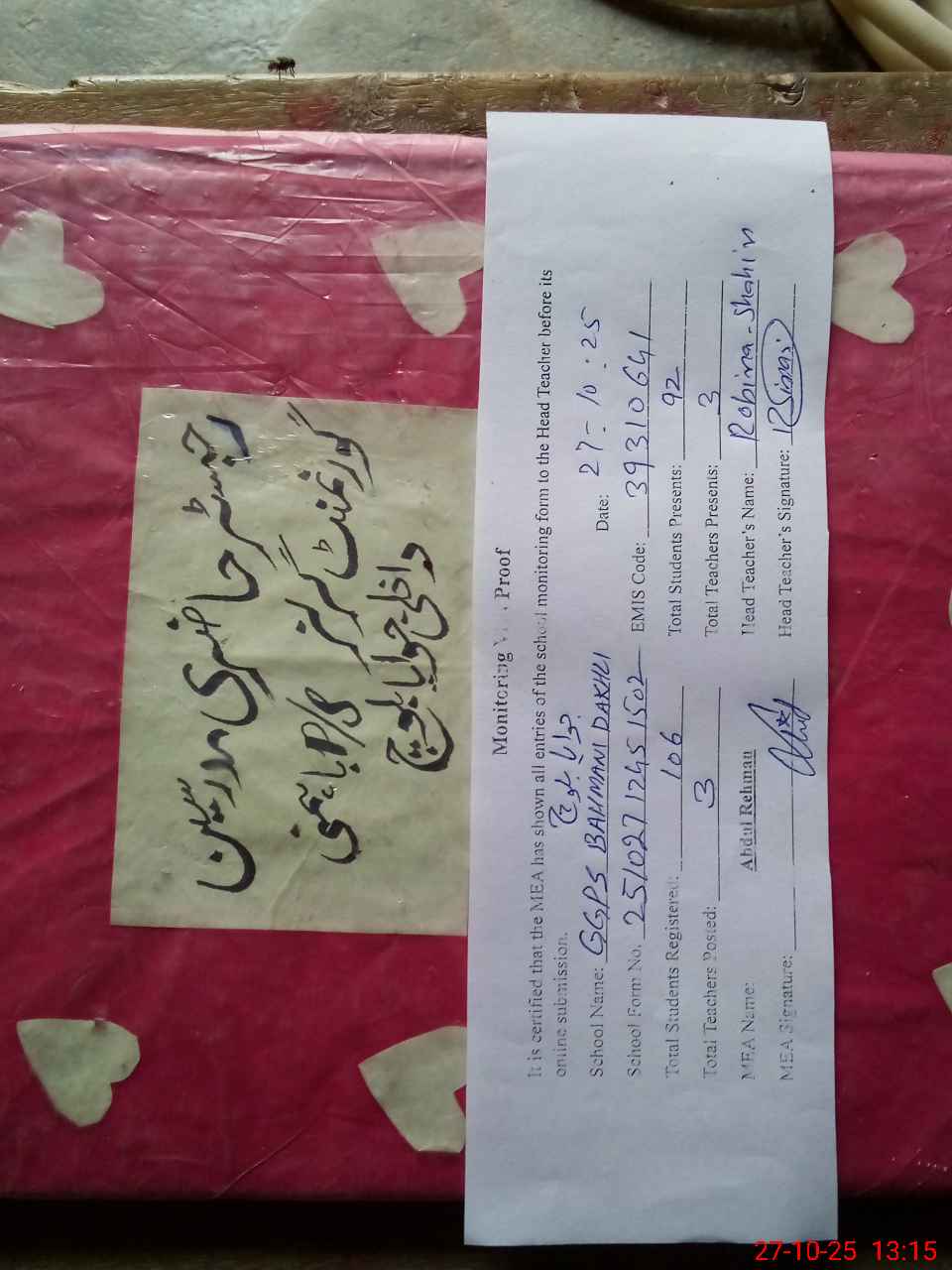 | Name: RO**** SH**** Designation: (School Headmaster's/Headmistress's) PST Phone/Cell Number: 03**** |