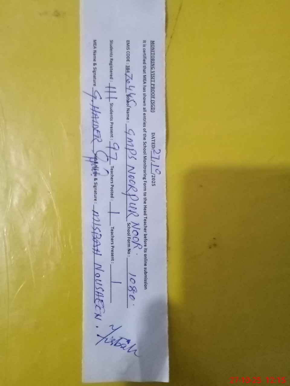 | Attendance Register | Head Teacher | MEA with School | Visit Proof |
