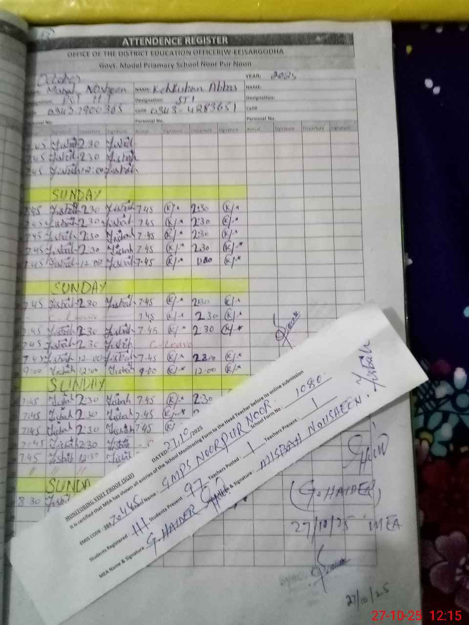 | Name: MI**** NO**** Designation: (School Headmaster's/Headmistress's) PST Phone/Cell Number: 03**** |