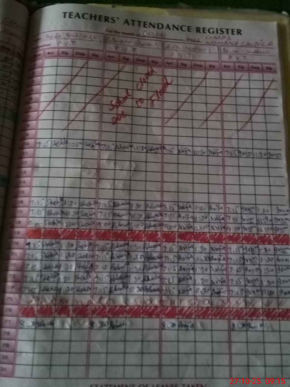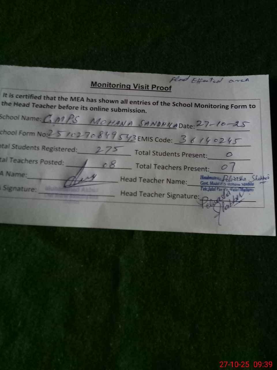 | Attendance Register | Head Teacher | MEA with School | Visit Proof |