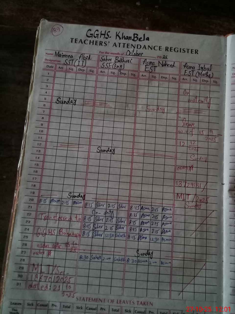 | Leave | Duty | Absent | Maternity | Medical | Ex- Pak |