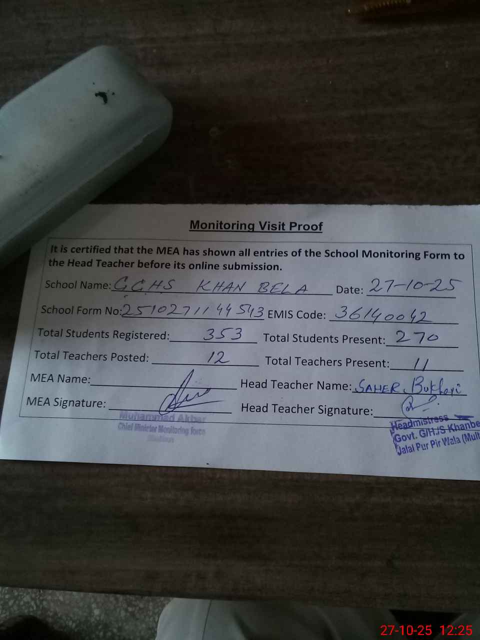 | Attendance Register | Head Teacher | MEA with School | Visit Proof |