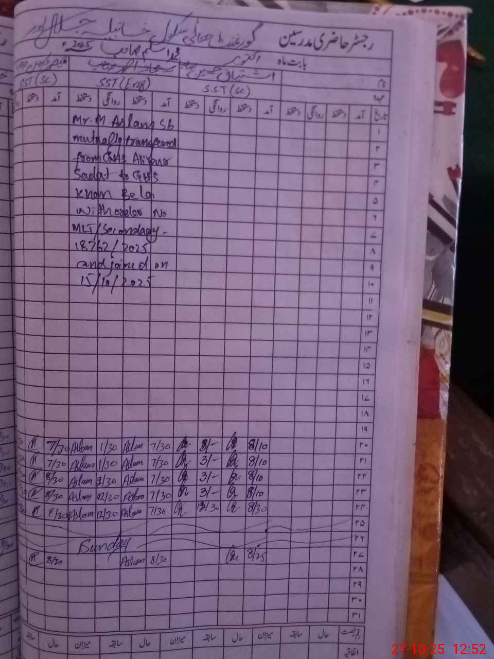 | CNIC | Full Name | Designation | R/C | Absence During Last Calender Month |