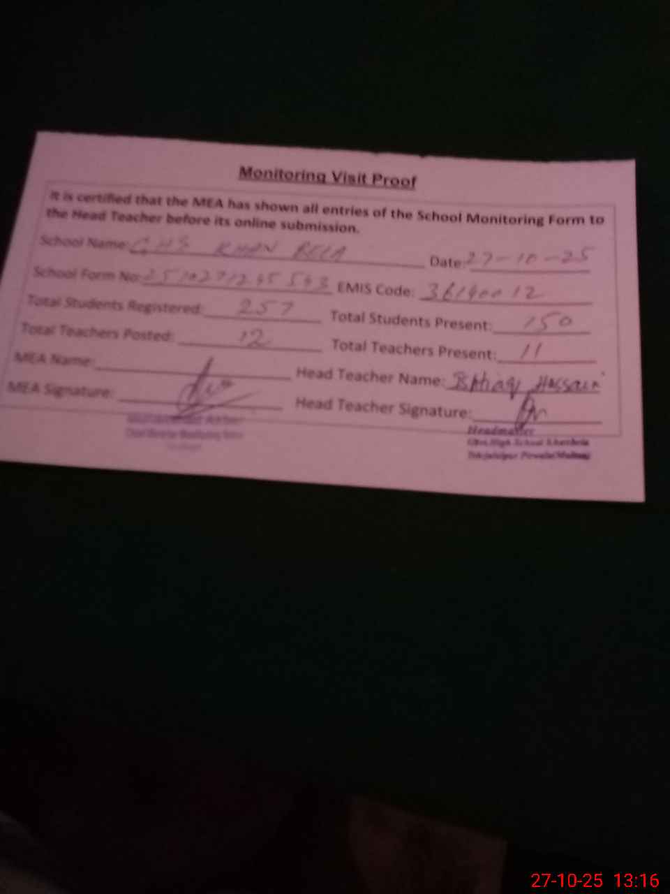 | Attendance Register | Head Teacher | MEA with School | Visit Proof |