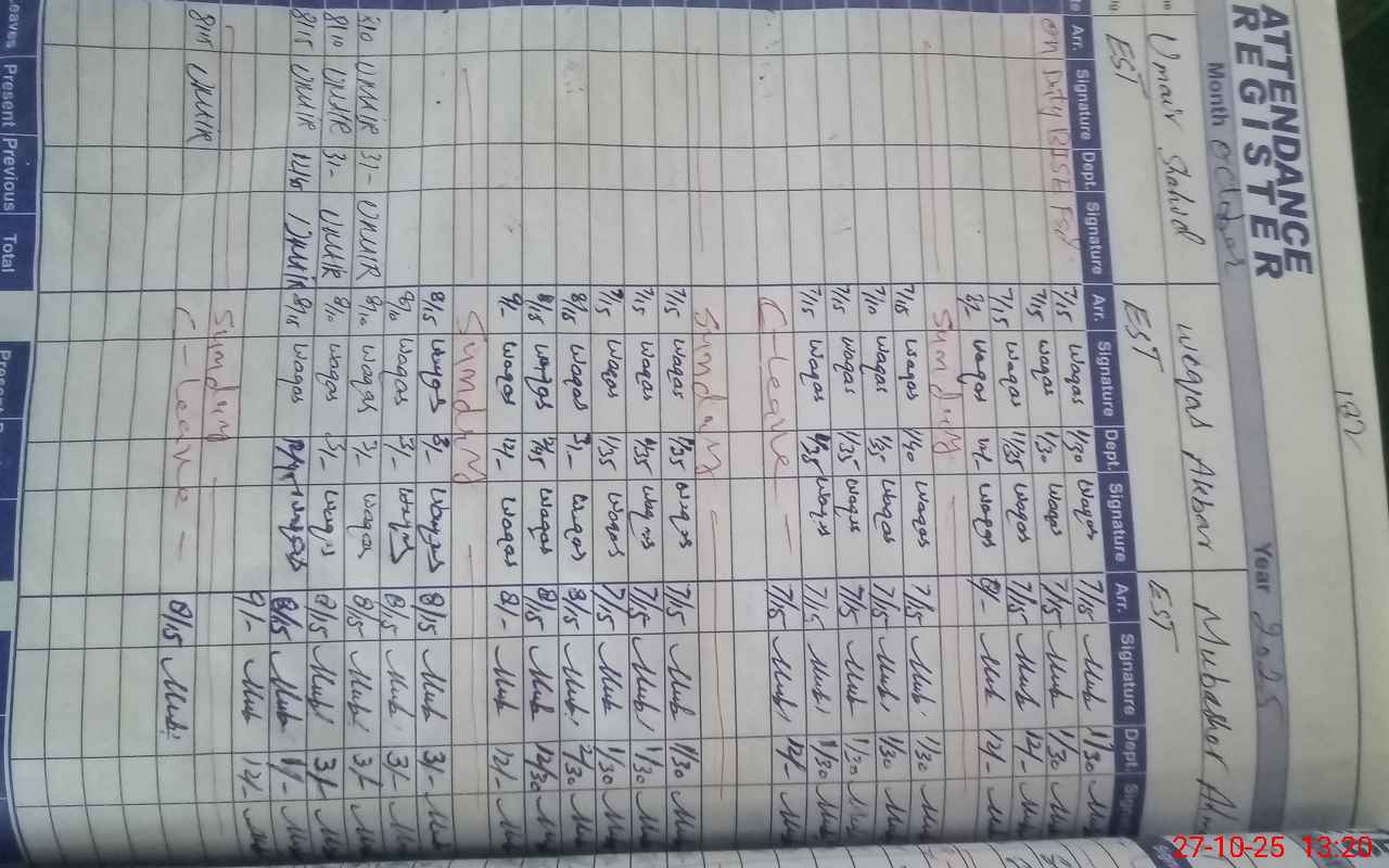 | CNIC | Full Name | Designation | R/C | Absence During Last Calender Month |