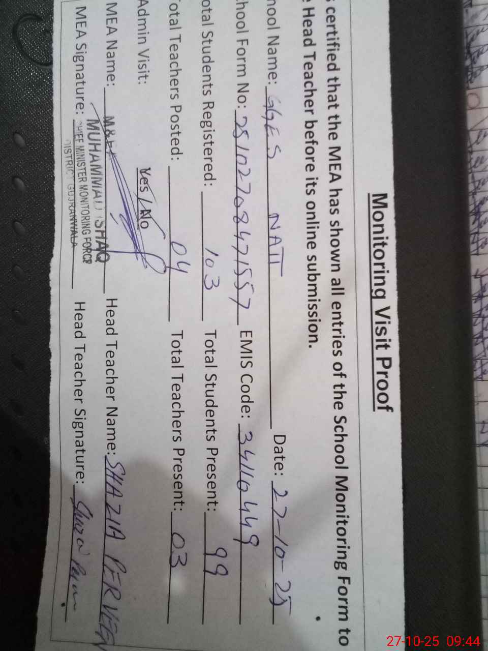 | Attendance Register | Head Teacher | MEA with School | Visit Proof |