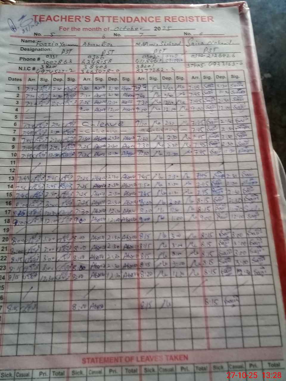 | CNIC | Full Name | Designation | R/C | Absence during last cal. month |