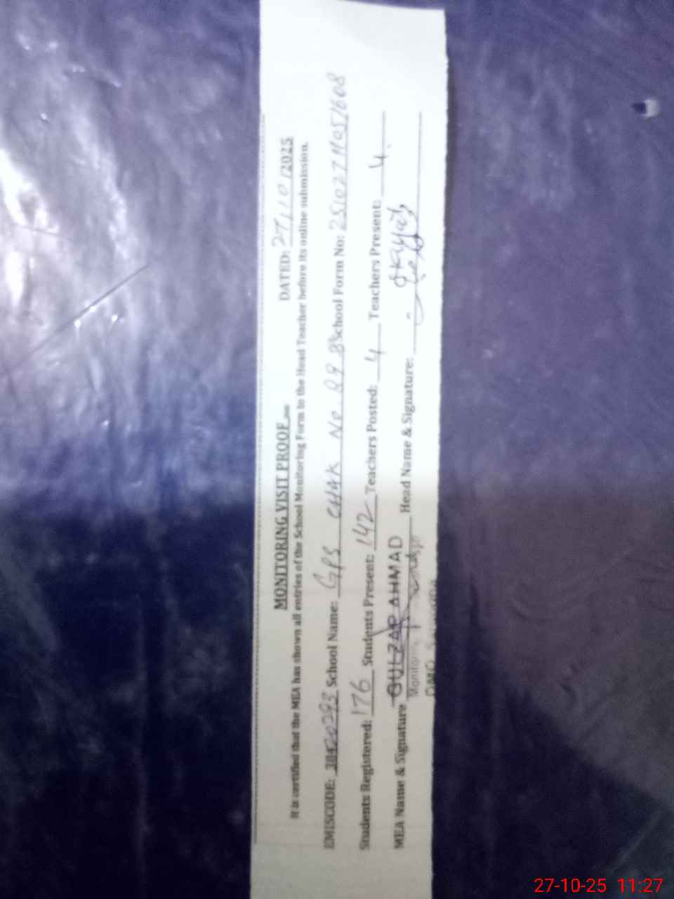 | Attendance Register | Head Teacher | MEA with School | Visit Proof |