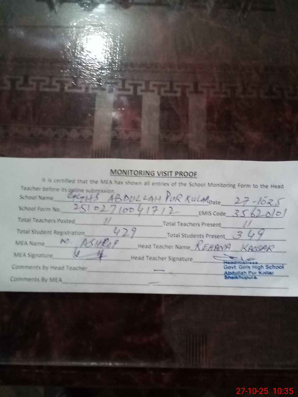| Attendance Register | Head Teacher | MEA with School | Visit Proof |