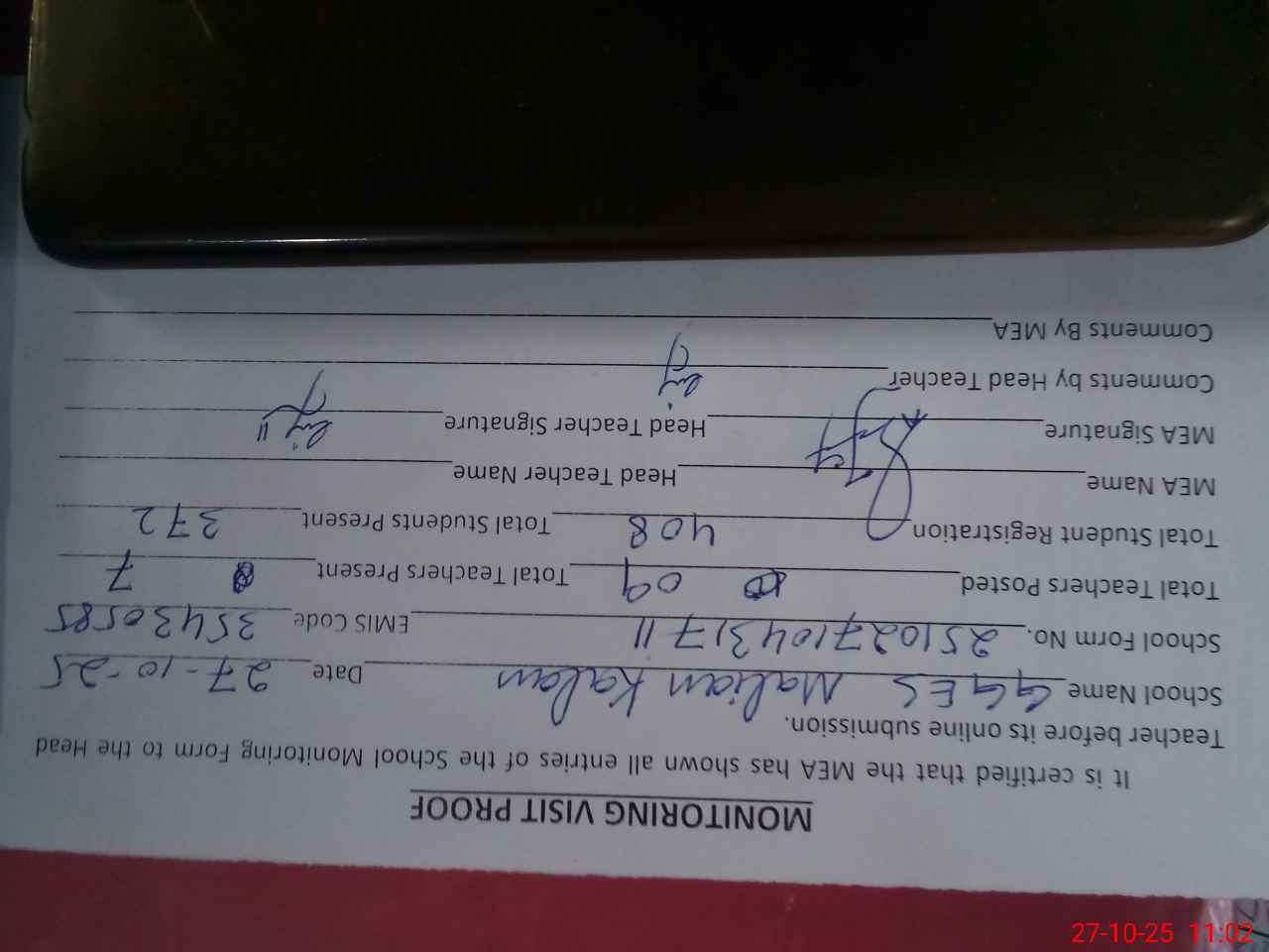 | Attendance Register | Head Teacher | MEA with School | Visit Proof |