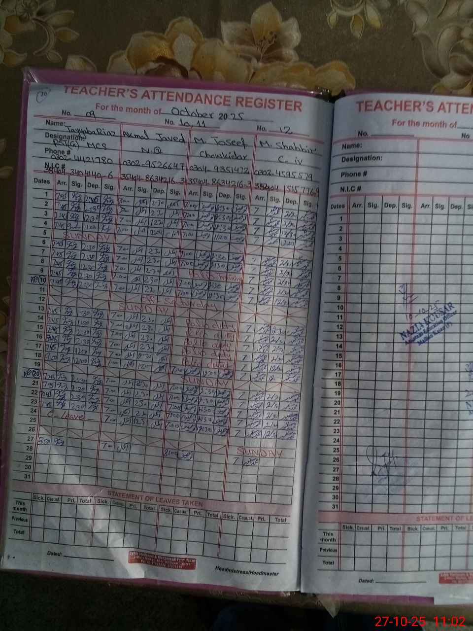 | CNIC | Full Name | Designation | R/C | Absence During Last Calender Month |
