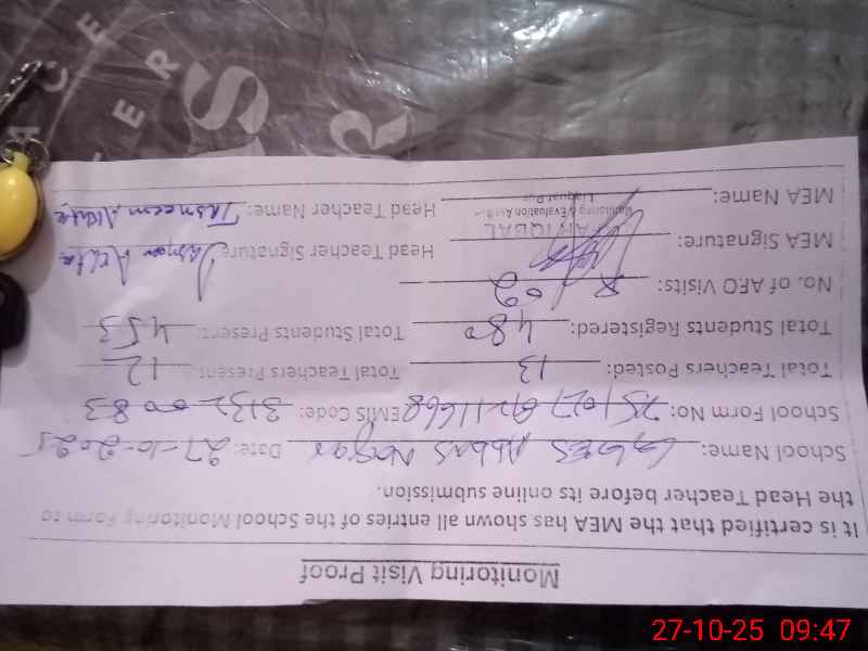 | Monitoring Date: 27-10-2025 | Start Time: 27-10-2025 09:16 AM | End Time: 27-10-2025 09:52 AM | Name of MEA: Za**** Iq**** | |
