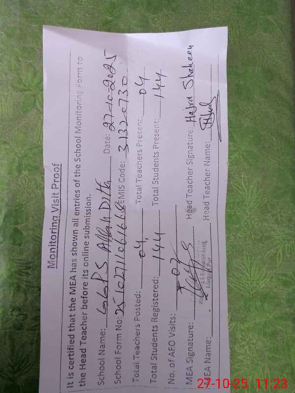 | EMIS Code: 31320730 | Name of School: GGPS ALLAH DITTA BEHLA | |||