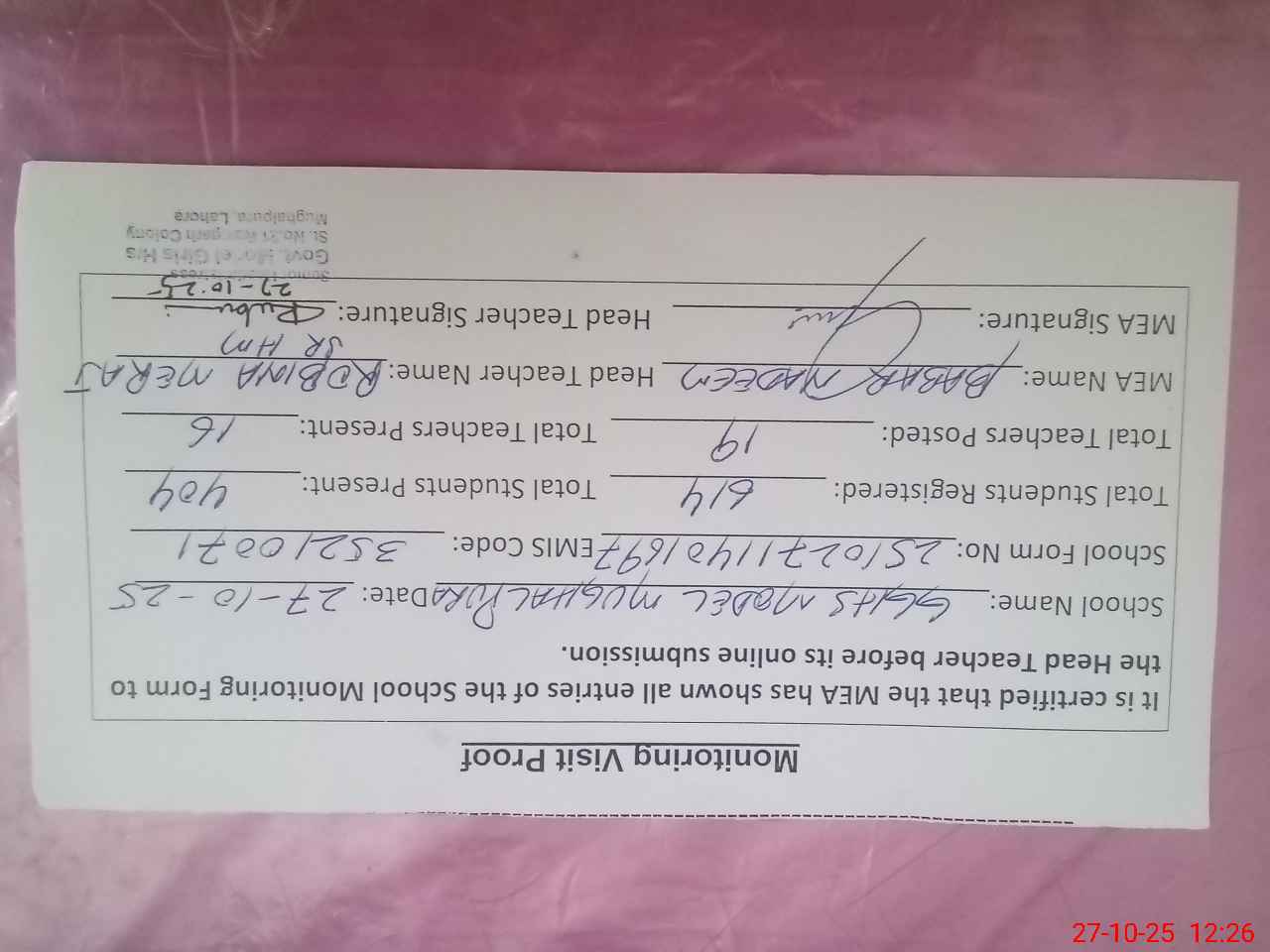 | Certified that this School was Inspected by the Undersigned MEA/DMO Today and the Information Stated Above is as Per Record. | |||||