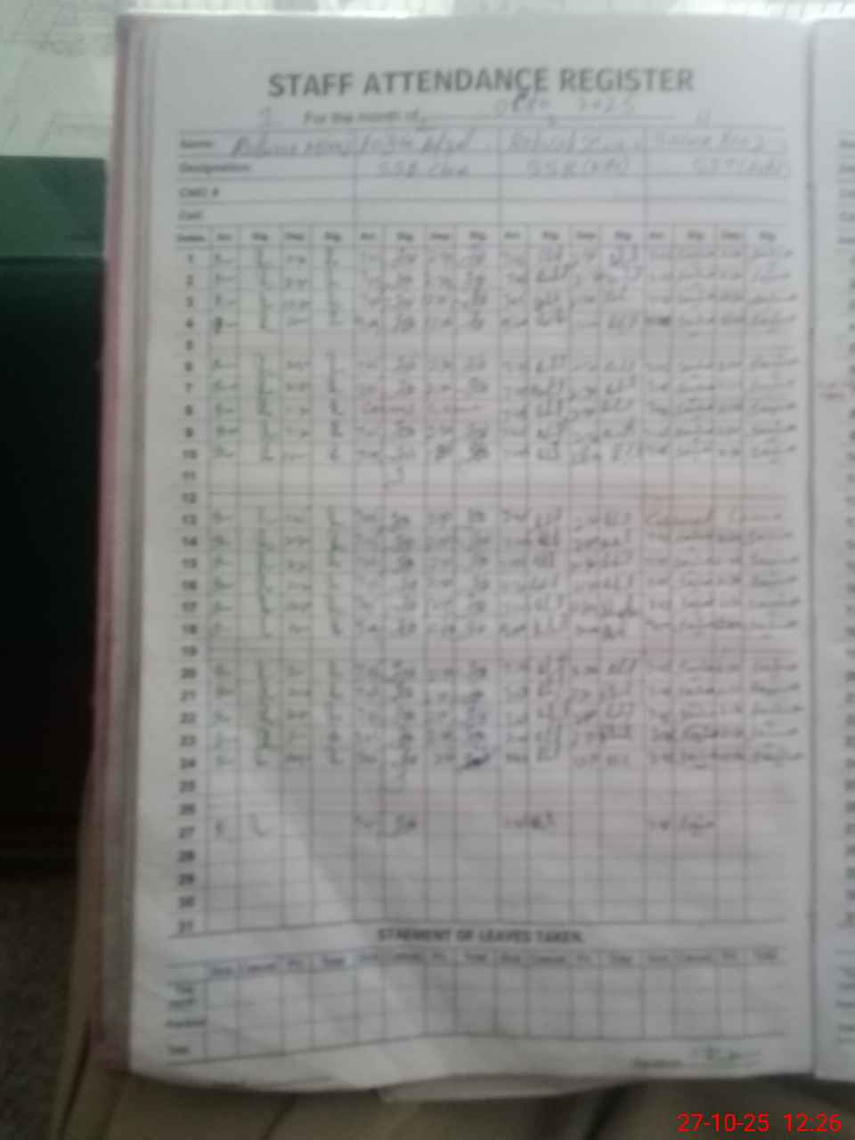 | CNIC | Full Name | Designation | R/C | Absence During Last Calender Month |