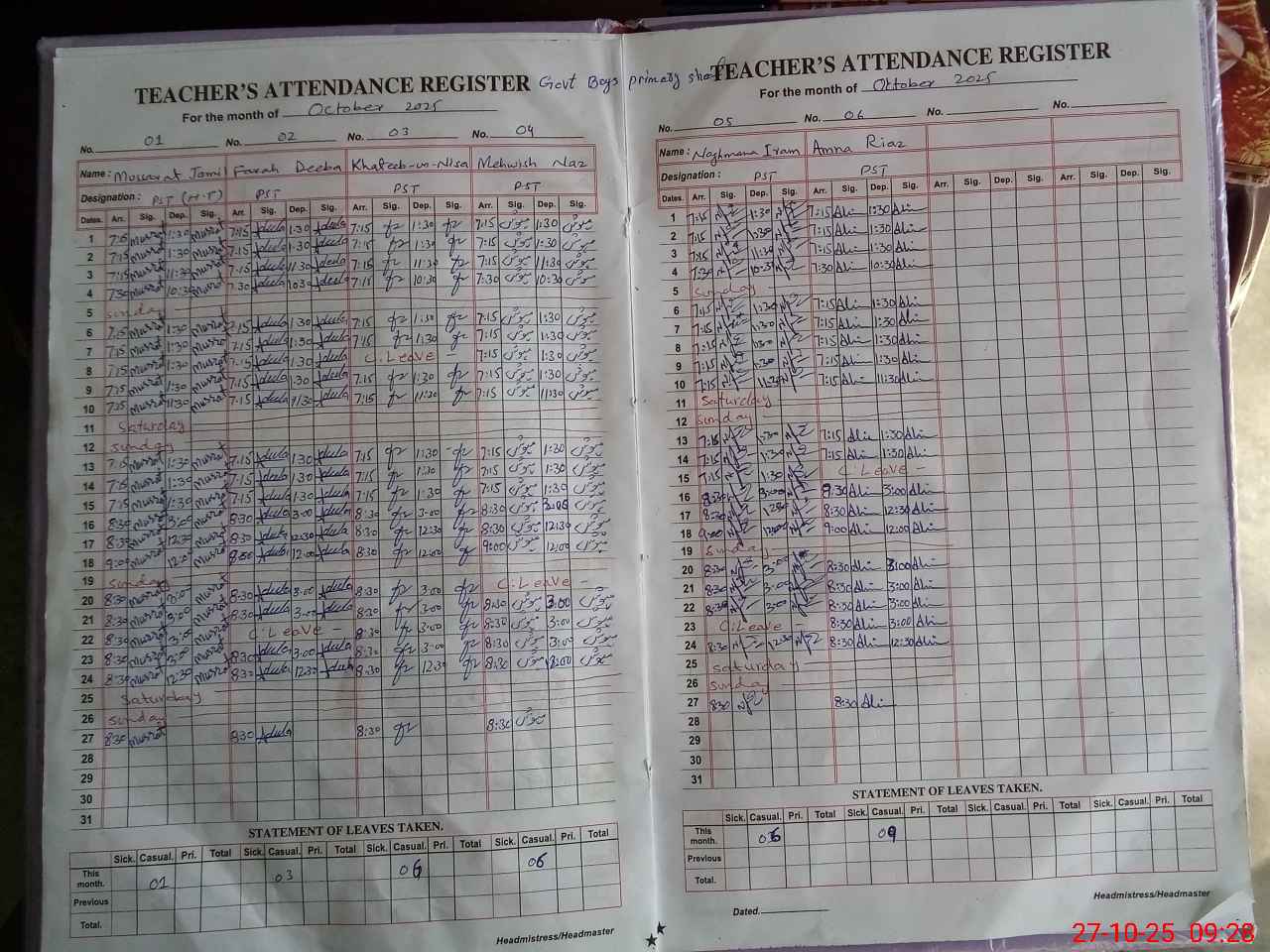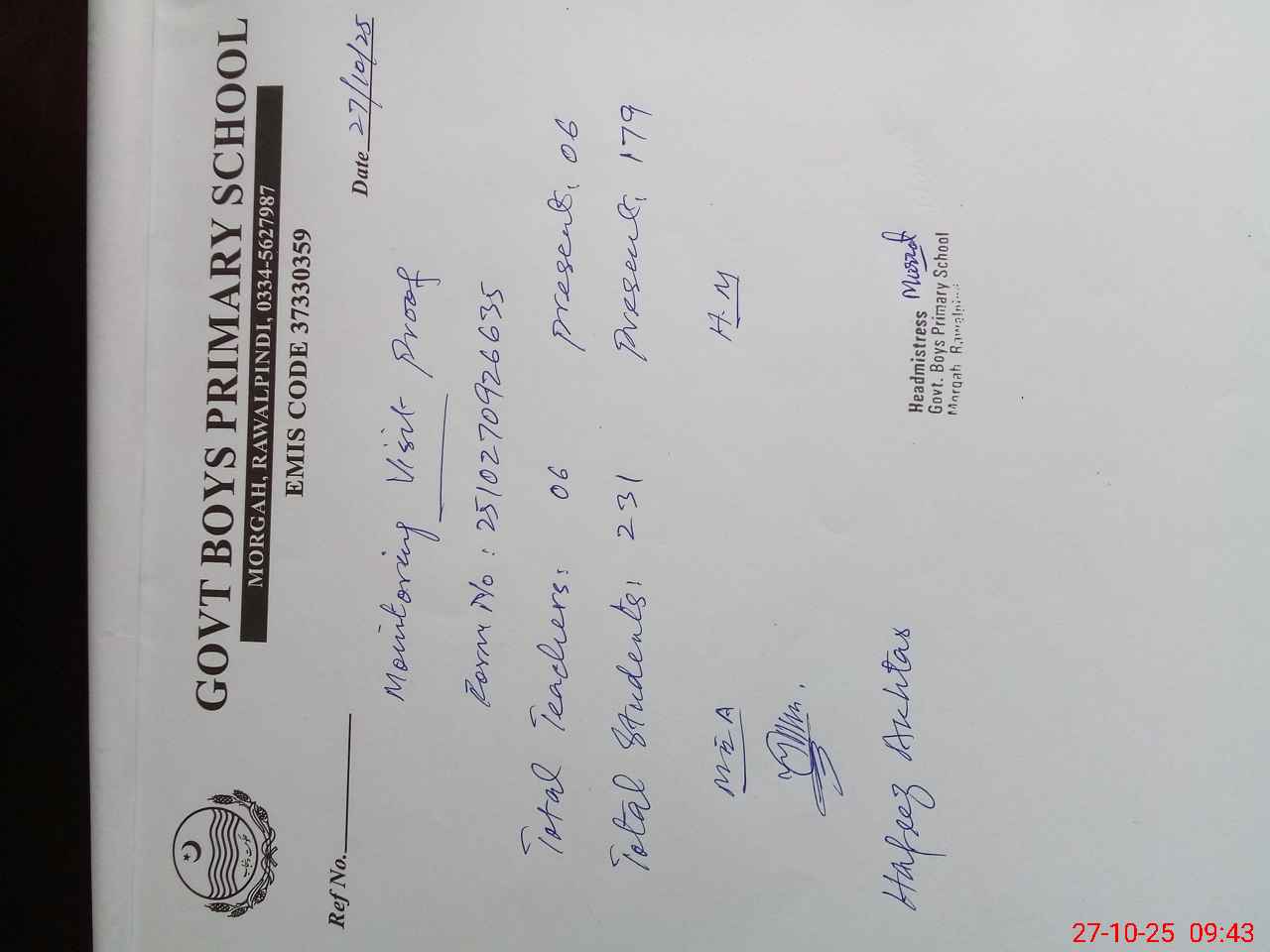 | Remarks (Use Separate Page if Required): NSB record not updated in pmiu and sis both apps Students of class 3 listed in pmiu app are not updated All students have left school after promotion from class 5 No AEO visit logged in log book after 26th May 2025 While a D DEO visit logged in log book on 1st September 2025 01 classroom required to be constructed 01 Non teaching staff post is vacant and required to be filled urgently | |||||