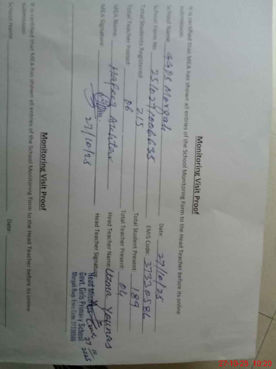| Remarks (Use Separate Page if Required): Teacher Aqsa Batool PST Science Maths is un authorised absent NSB record not updated in pmiu and sis both apps Students of class Nursery listed in pmiu app are not updated 10 students are in classes 2 to 4 while 05 students have left school 01 toilet required to be constructed | |||||