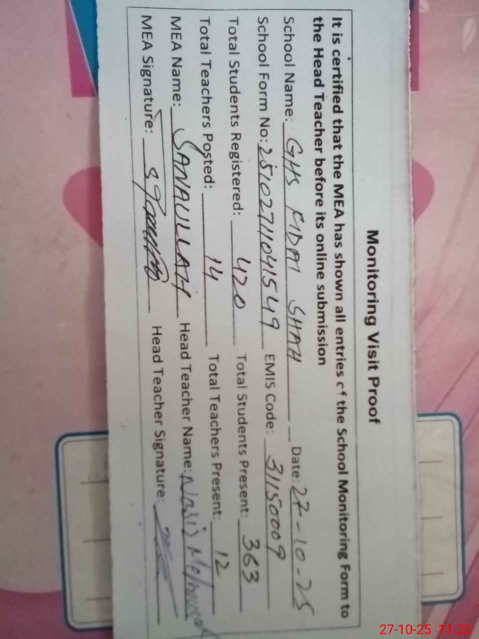 | EMIS Code: 31150009 | Name of School: GHS FIDAI SHAH | |||