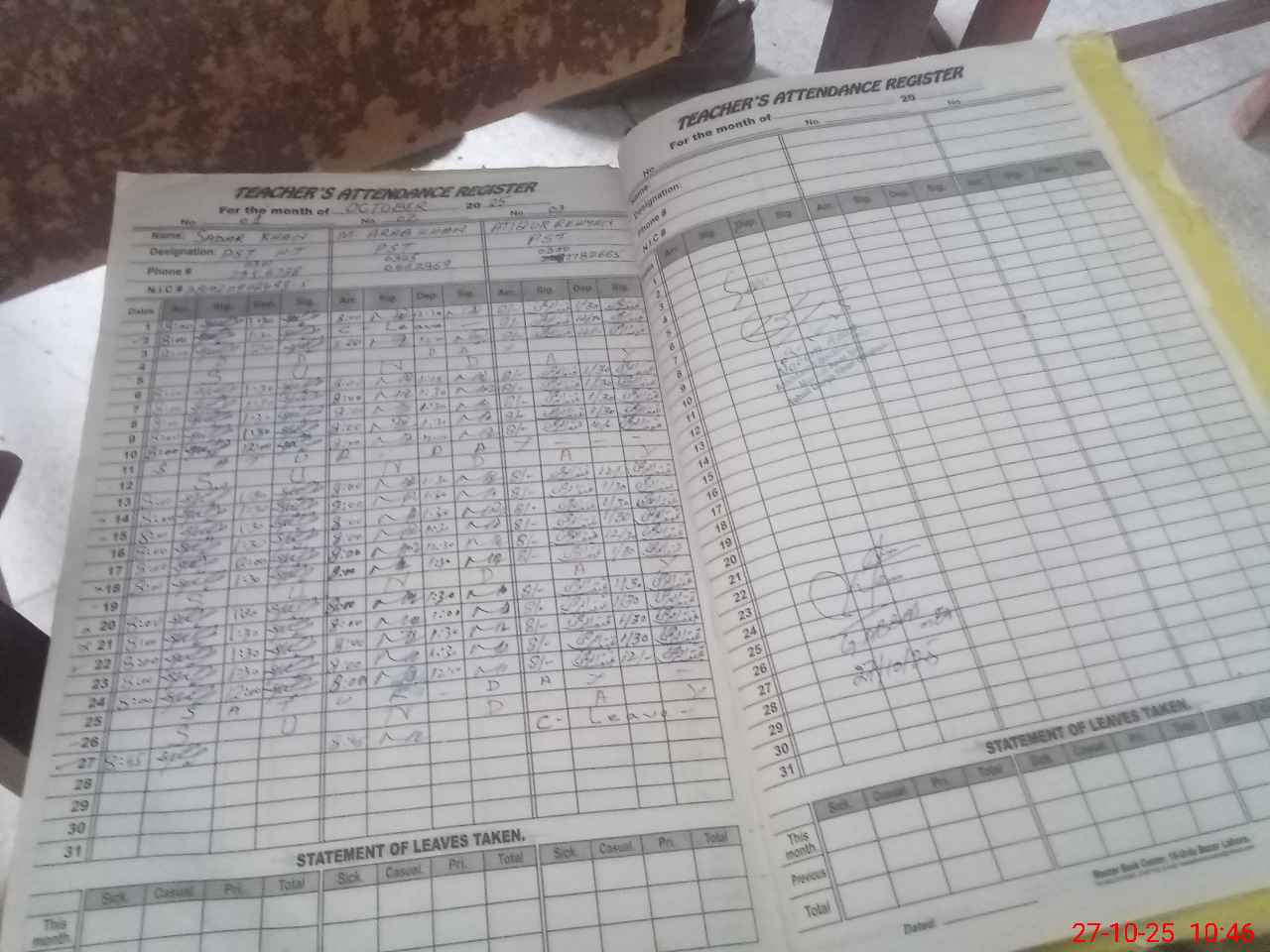 | CNIC | Full Name | Designation | R/C | Absence During Last Calender Month |